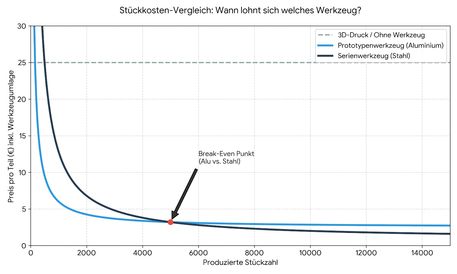 - Bei sehr kleinen Stückzahlen dominiert oft der Werkzeugpreis die Gesamtkosten.
